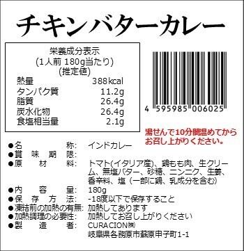 【商品名】チキンバターカレー 【原材料】トマト、鶏もも肉、生クリーム、無塩バター、砂糖、ニンニク、生姜、香辛料、塩 【内容量】一人前(180g) 【賞味期限】パッケージ上に記載 【保存方法】-18℃以下で保存すること 【凍結前加熱の有無】加熱してあります 【加熱調理の必要性】加熱してお召し上がりください 【製造者】CURACION株式会社 岐阜県各務原市蘇原申子町1-1