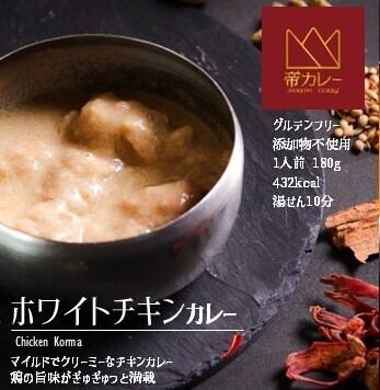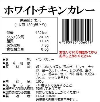 【商品名】チキンコルマ 【原材料】鶏もも肉、玉ねぎ、カシューナッツ、ヨーグルト、ギー、サラダ油、生クリーム、香辛料、塩 【内容量】一人前(180g) 【賞味期限】パッケージ上に記載 【保存方法】-18℃以下で保存すること 【凍結前加熱の有無】加熱してあります 【加熱調理の必要性】加熱してお召し上がりください 【製造者】CURACION株式会社 岐阜県各務原市蘇原申子町1-1