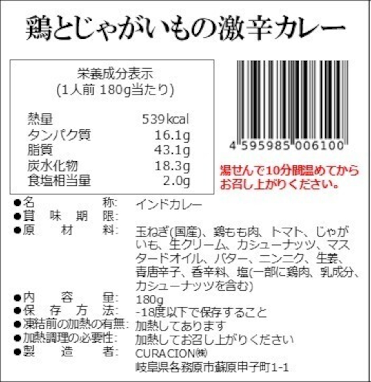 【商品名】鶏とじゃがいもの激辛カレー 玉ねぎ(国産)、鶏もも肉、トマト、じゃがいも、生クリーム、カシューナッツ、マスタードオイル、バター、ニンニク、生姜、青唐辛子、香辛料、塩(一部に鶏肉、乳成分、カシューナッツを含む)【内容量】一人前(180g) 【賞味期限】パッケージ上に記載 【保存方法】-18℃以下で保存すること 【凍結前加熱の有無】加熱してあります 【加熱調理の必要性】加熱してお召し上がりください 【製造者】CURACION株式会社 岐阜県各務原市蘇原申子町1-1