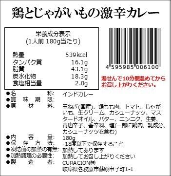 【商品名】鶏とじゃがいもの激辛カレー 玉ねぎ(国産)、鶏もも肉、トマト、じゃがいも、生クリーム、カシューナッツ、マスタードオイル、バター、ニンニク、生姜、青唐辛子、香辛料、塩(一部に鶏肉、乳成分、カシューナッツを含む)【内容量】一人前(180g) 【賞味期限】パッケージ上に記載 【保存方法】-18℃以下で保存すること 【凍結前加熱の有無】加熱してあります 【加熱調理の必要性】加熱してお召し上がりください 【製造者】CURACION株式会社 岐阜県各務原市蘇原申子町1-1